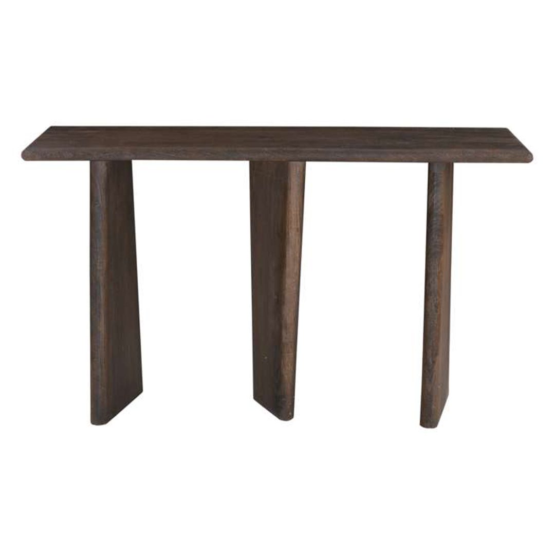 The Lasso End Table features a modern, organic-inspired design. The thick, soft-edged tabletop sits on a unique, offset, tapered base design. This end table is constructed with solid mango wood that’s been sandblasted for texture with a deep, antiqued brown stain that highlights the features of the natural wood. Look for other items in the Lasso Collection to complete the set.