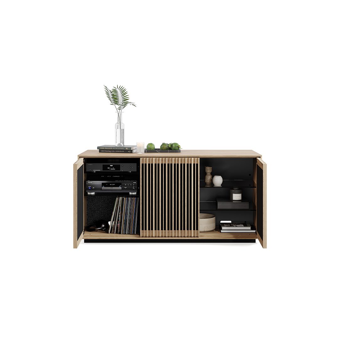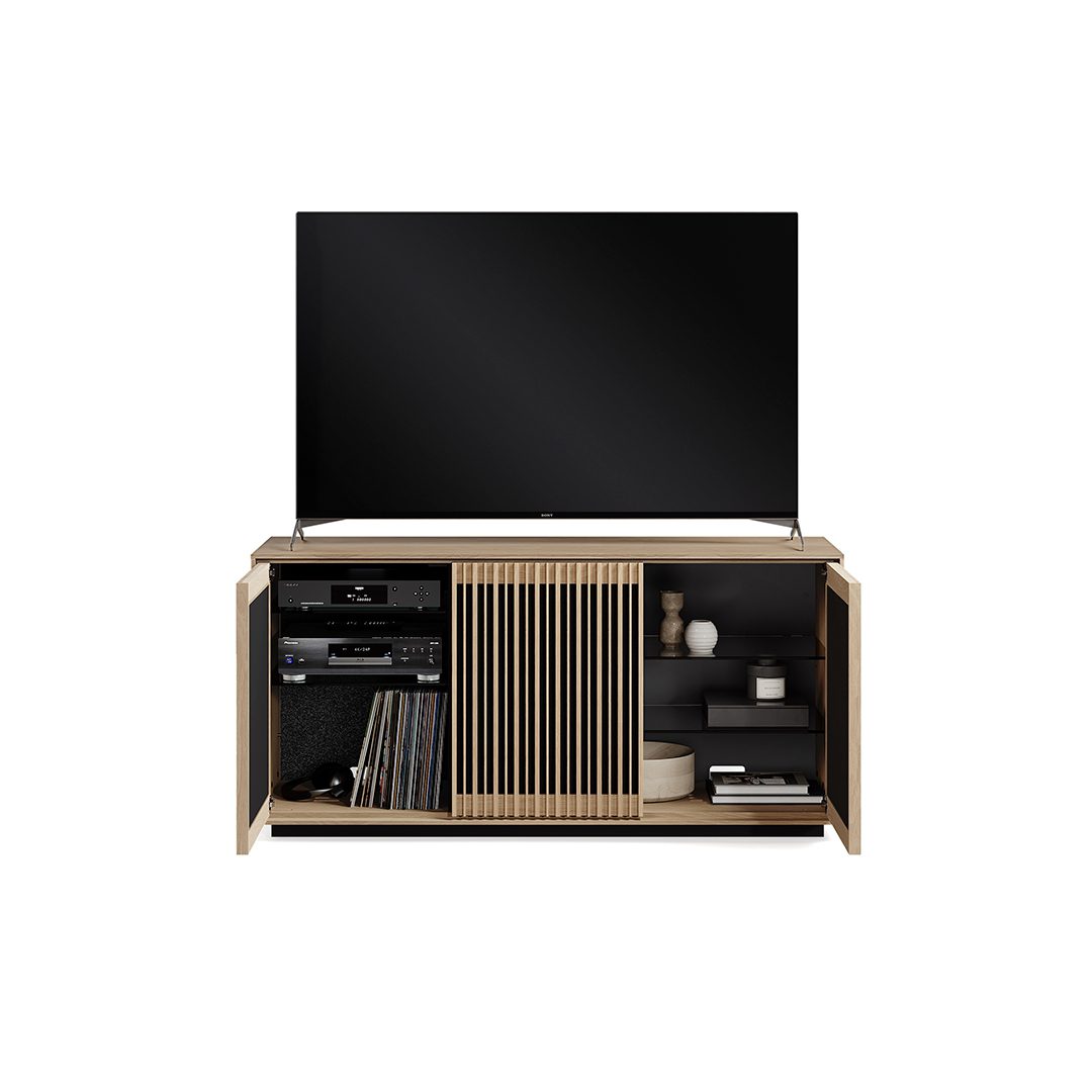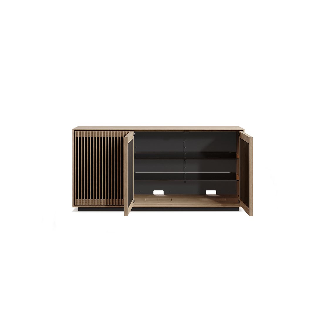 Media + Storage Console Designed to house your media essentials and store your prized possessions, this elegant three-door cabinet harmonizes form and function beautifully.