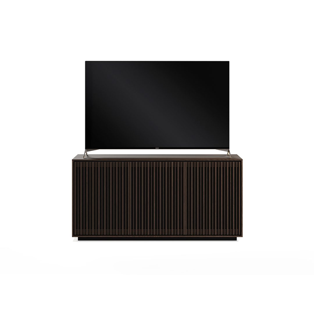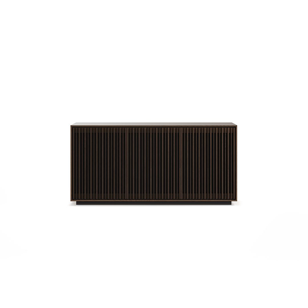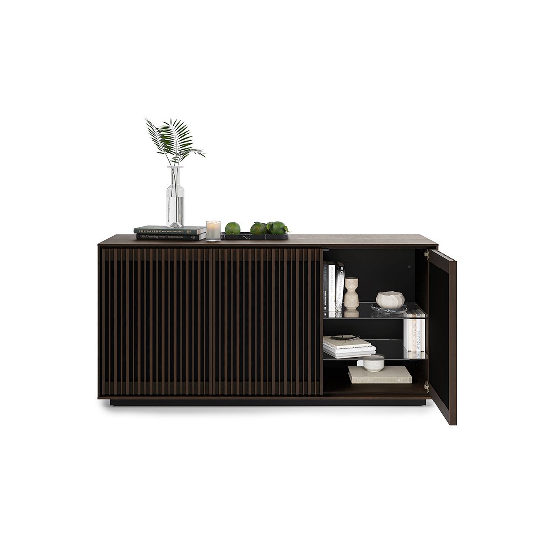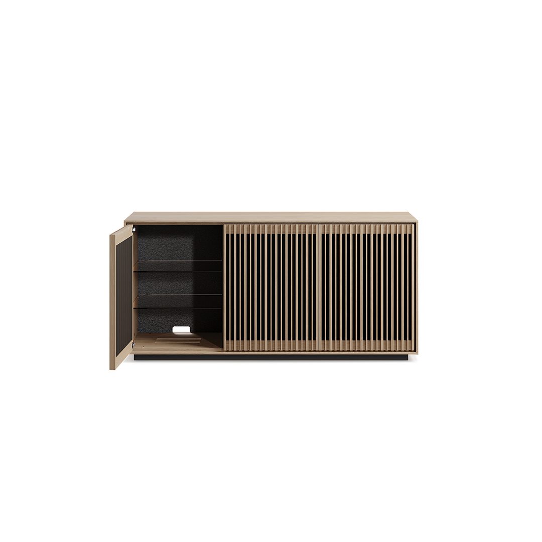Media + Storage Console Designed to house your media essentials and store your prized possessions, this elegant three-door cabinet harmonizes form and function beautifully.