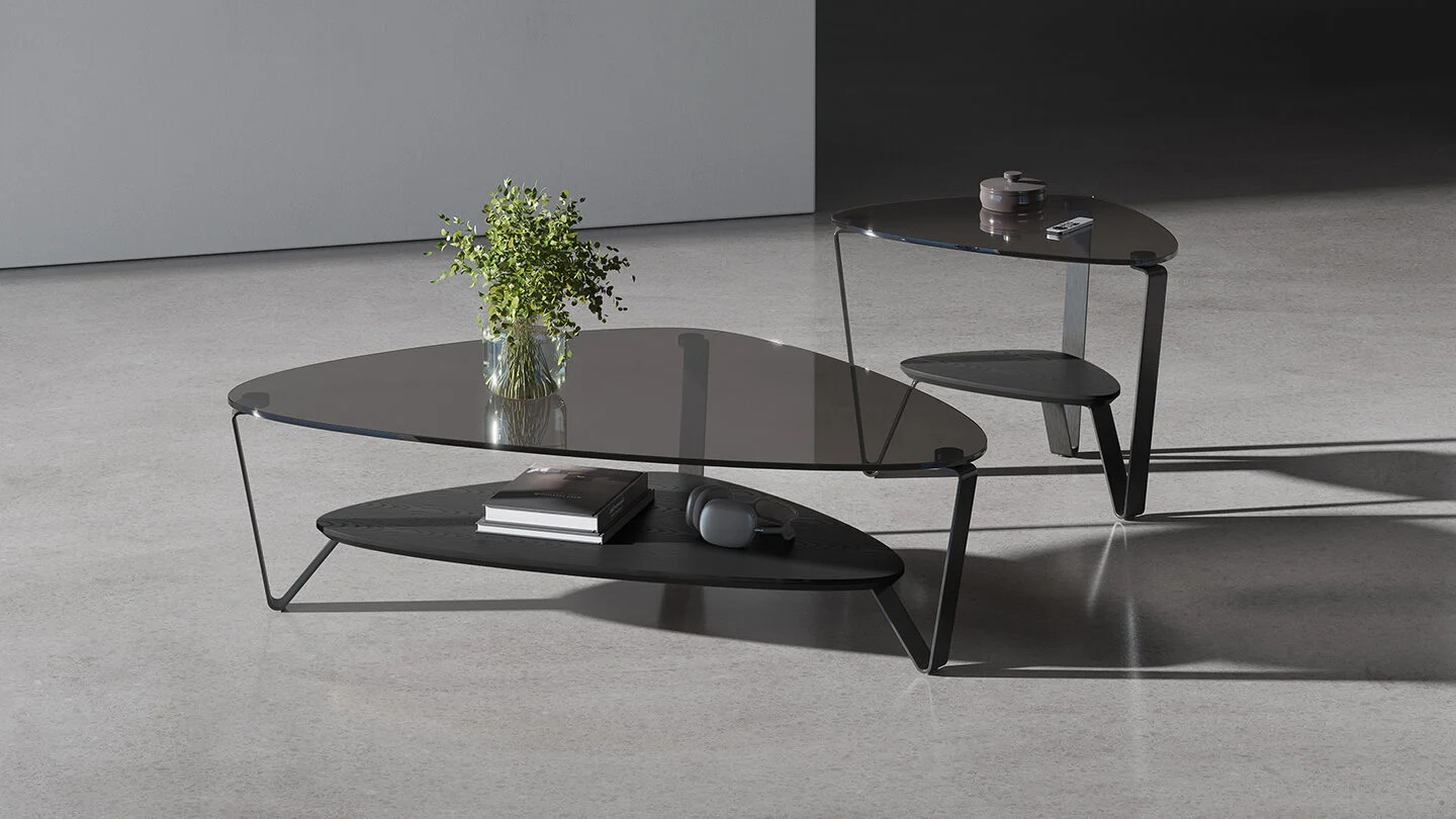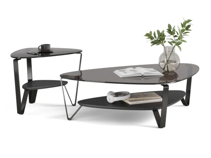 #1363 A versatile and distinctive triangular shape makes this glass-topped coffee table an excellent choice for various settings and seating. Dimensions: W: 55″ x D: 33.5″ x H: 15.5″