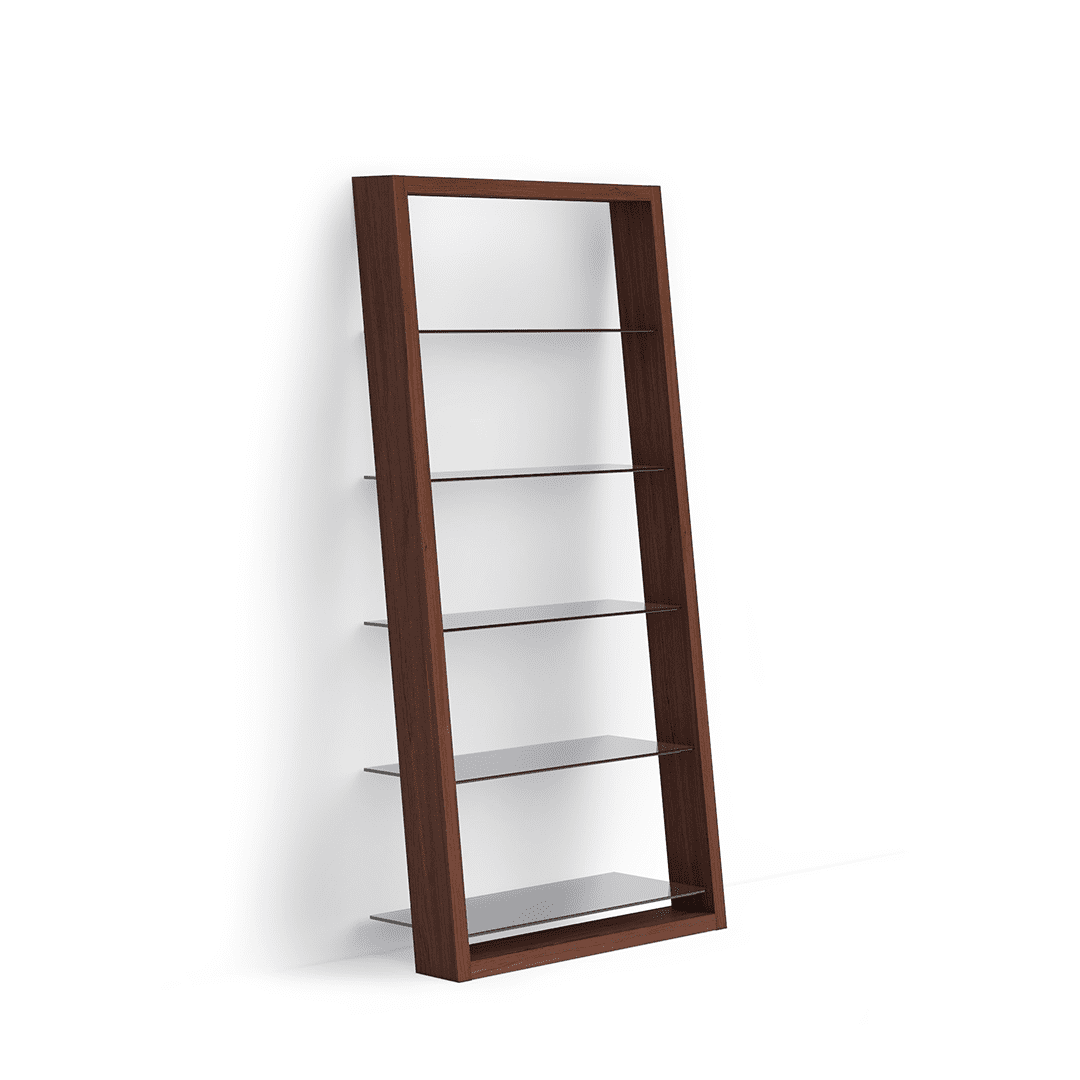 Distinctive leaning shelf unit with glass shelves. The Eileen shelf looks great alone or when combined to create a complete wall shelving system.