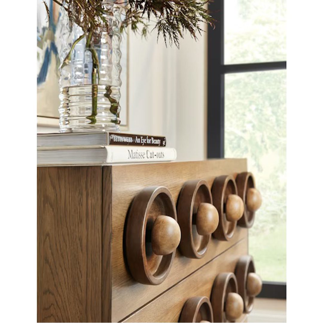 The three-drawer accent chest showcases a refined design with White Oak Veneers and a round, contrasting darker wood backplate with large, round wood knobs. With three self-closing drawers, it provides ample storage while adding an air of sophistication to bedrooms, hallways, or living rooms.