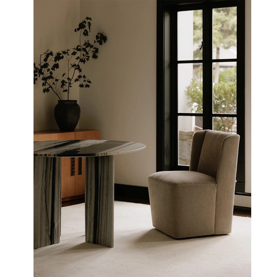 The Cormac rolling dining chair is all about comfort, with a generously padded seat and backrest, a slight curve to the back, and caster wheels that glide effortlessly across the floor. Crafted from high-performance fabric that is soft to the touch yet resilient to stains, spills, and daily wear.
