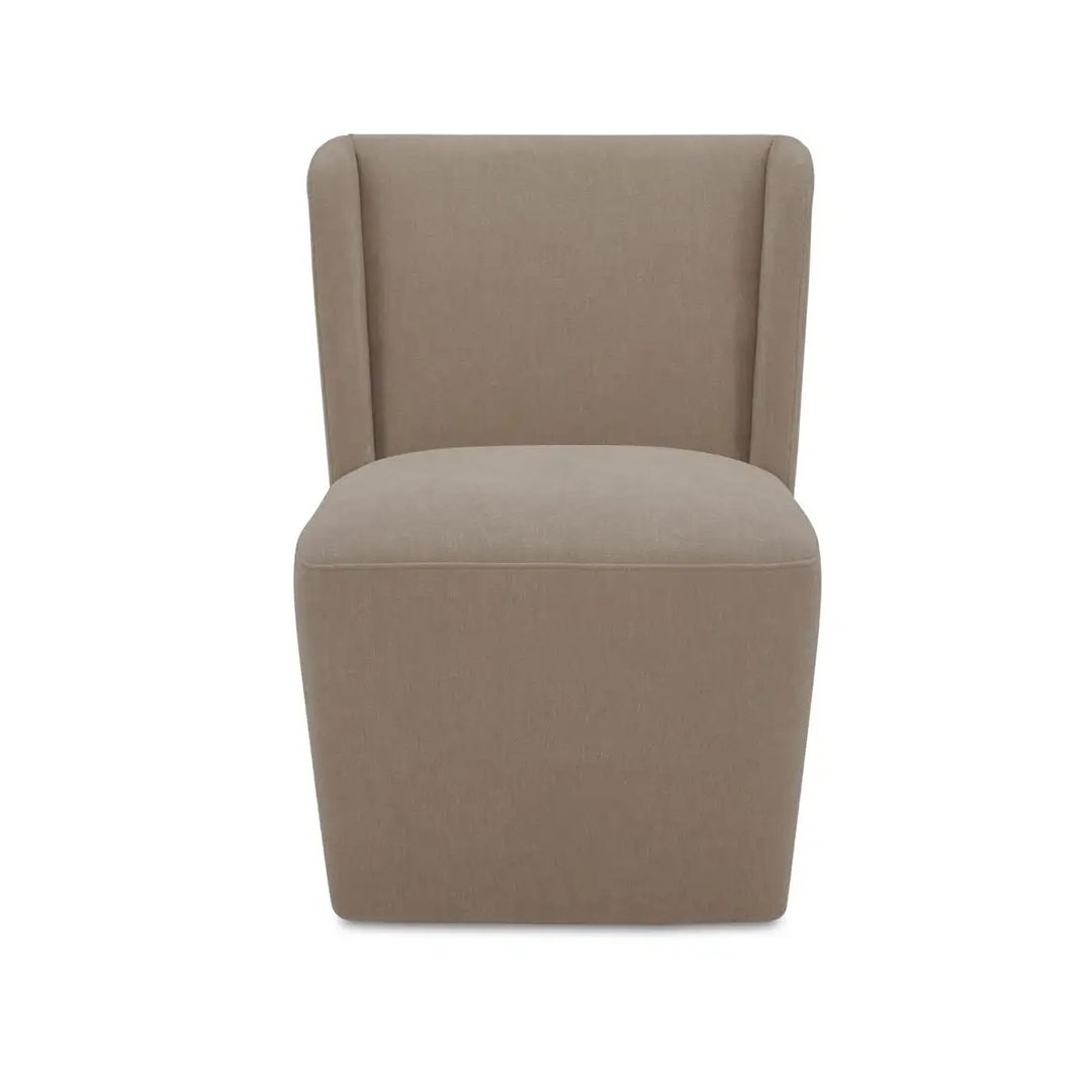 The Ellie dining chair features a padded winged backrest, a refined invitation to gather. A robust rubberwood frame in a dark espresso brown finish harmonizes with the rustic, warm brown, easy-to-clean performance fabric upholstery, adding vintage charm with modern convenience. This versatile design complements a myriad of interior styles.