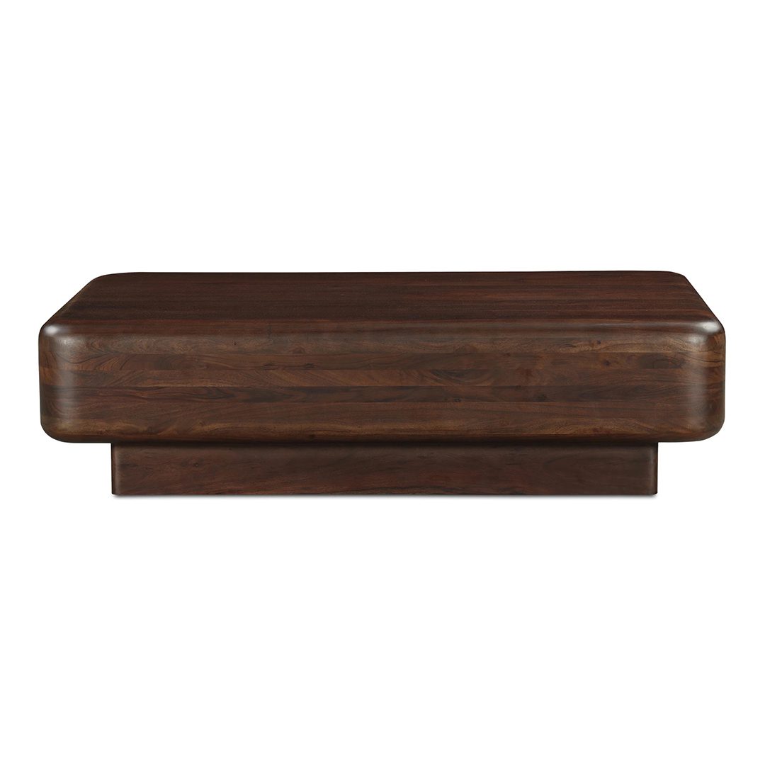 The Eton end table is a study in contrasts, marrying bold geometry with gentle curves. Crafted from rich Acacia wood, the substantial top appears to float above a recessed base, creating visual intrigue. Each piece showcases unique grain patterns through its thoughtful design and natural beauty as its dark brown finish matures the overall look.