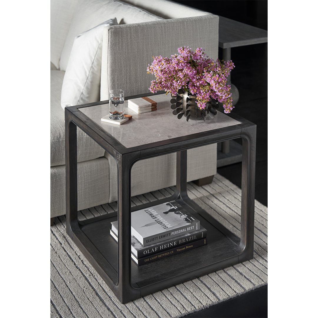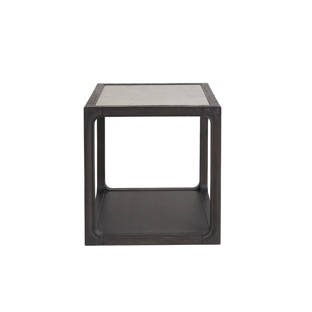 The Halen End Table exudes chic elegance with its slender, square form finished in the sophisticated Ravenwood hue, enhanced by an inset stone top that lends a polished and contemporary air to its sleek design.