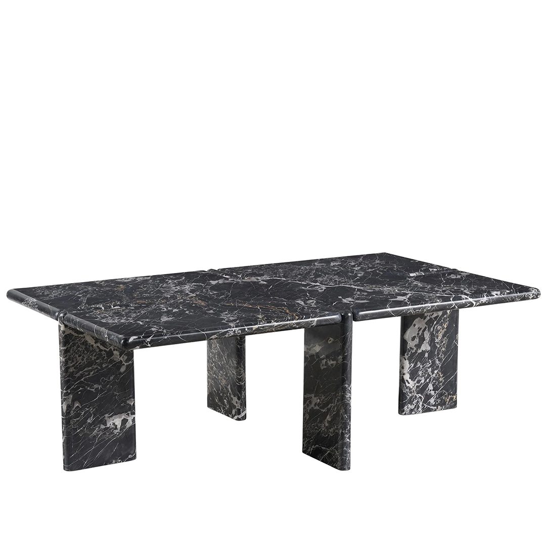 The Magnus Cocktail Table stands as a bold centerpiece, crafted from deep black Golden Portoro Marble. Its robust, sleek silhouette commands attention, with slab-like legs that accentuate an intricate play of stone and form. This table is a statement of elegance and strength, perfectly blending luxurious materials with a commanding presence.