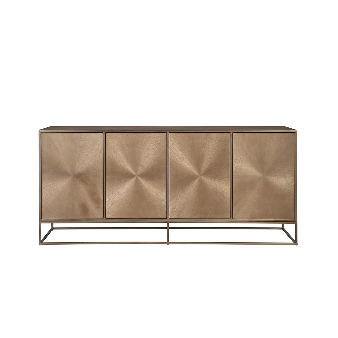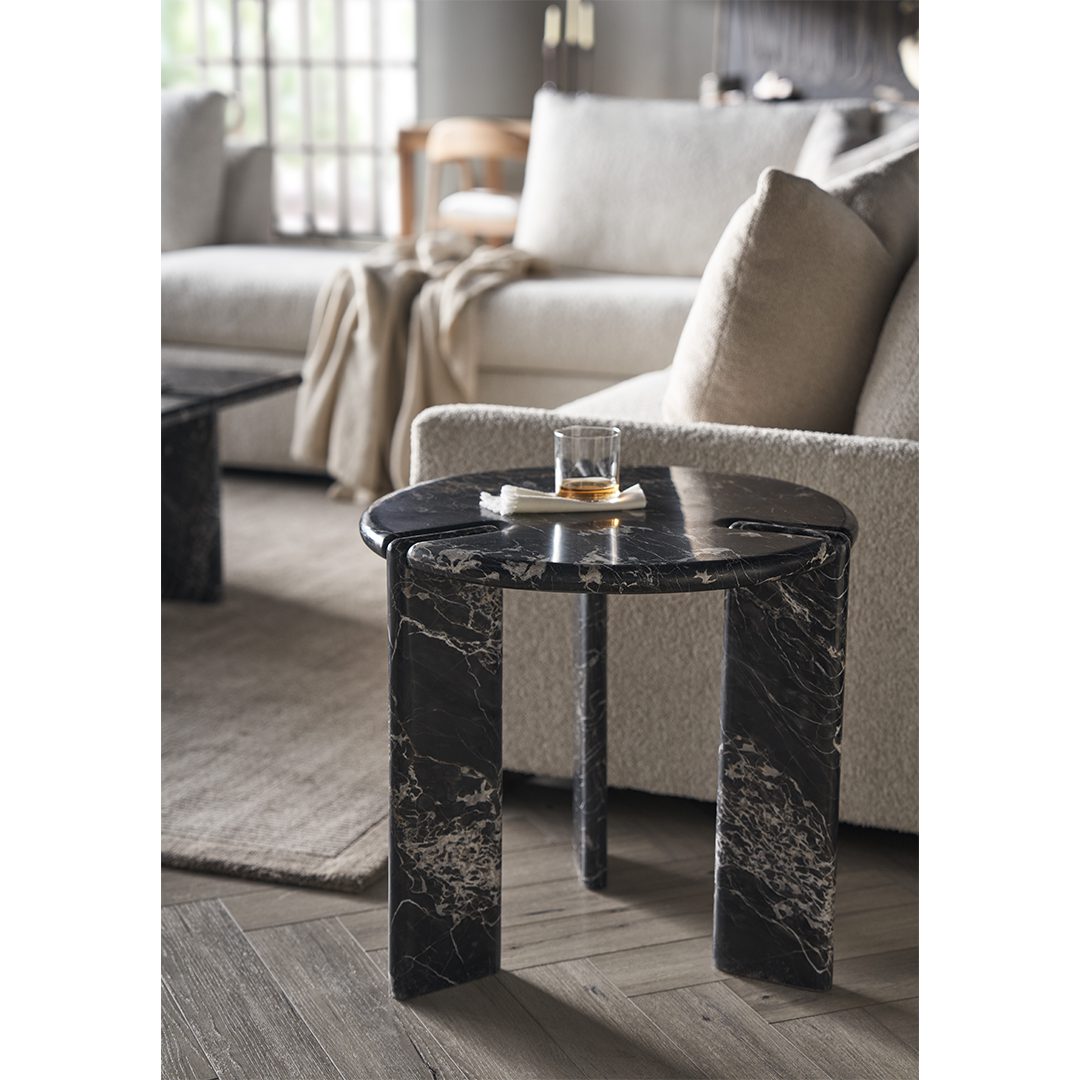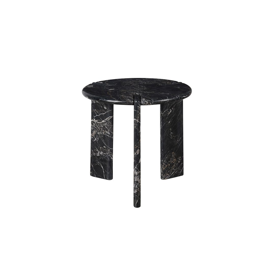 The Magnus End Table, crafted in deep black Golden Portoro Marble, presents a striking circular silhouette with three slab-like legs, each connected by unique, intricate details. This robust and sleek design offers a commanding presence, blending luxurious materiality with an eye-catching play on form.
