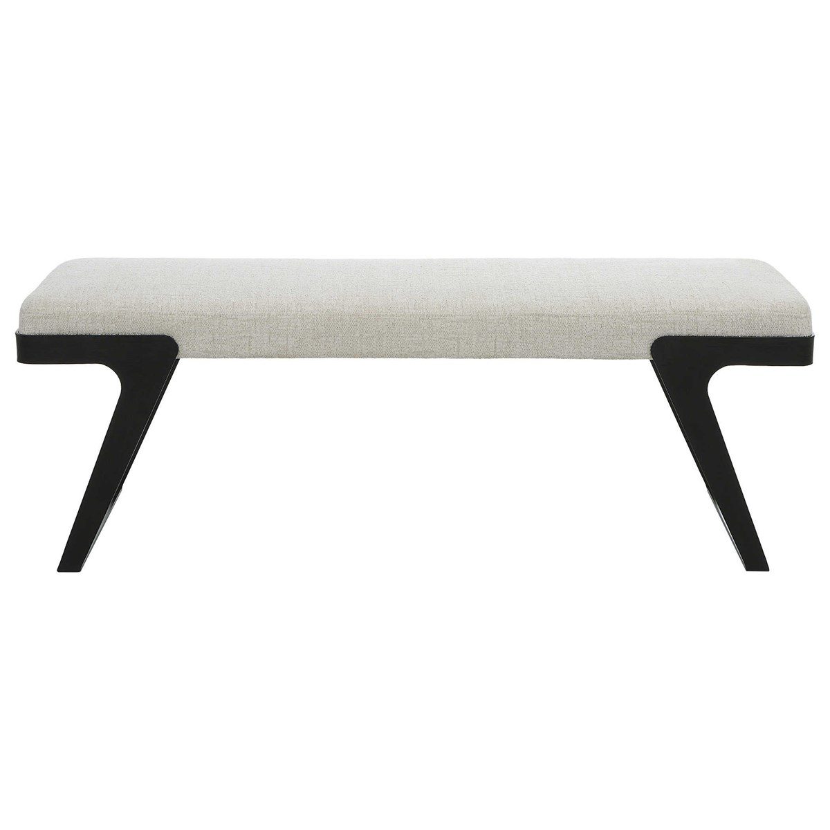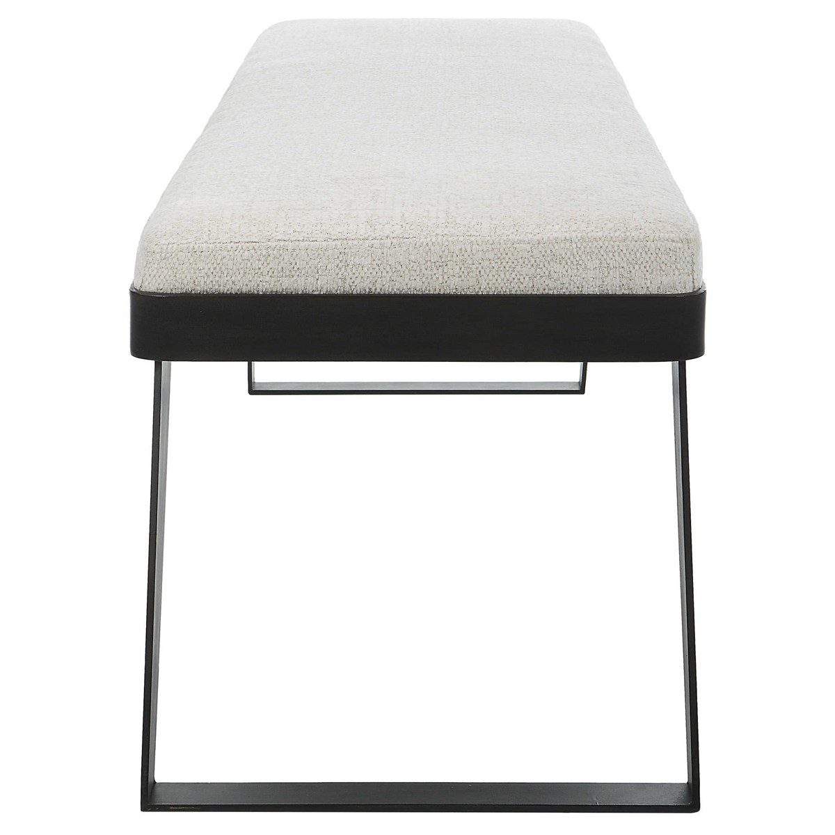 The modern Hover Bench is streamlined with an aged black curved iron base and cushioned seat. Upholstered in a soft white boucle performance fabric.
